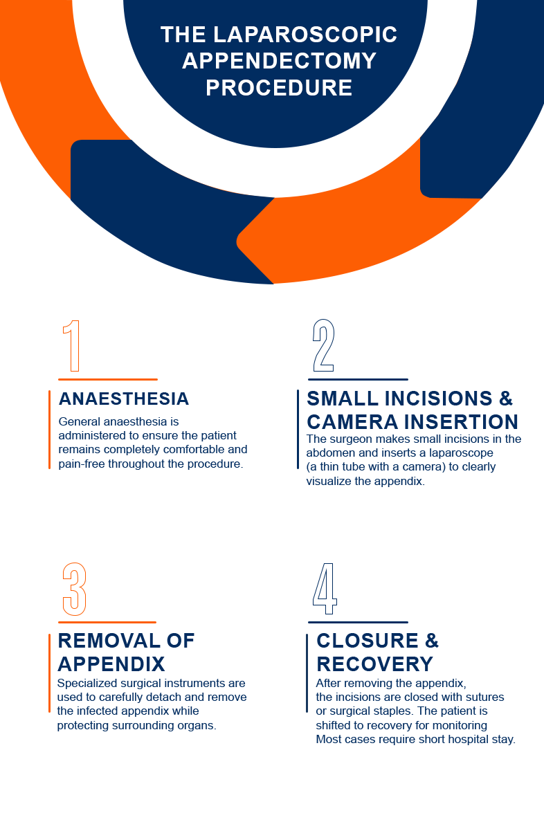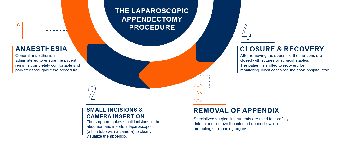 Laparoscopic Appendectomy is a minimally invasive technique in which the appendix is removed using small incisions and a specialized camera (laparoscope). This approach offers less pain, smaller scars, and faster recovery compared to open surgery.