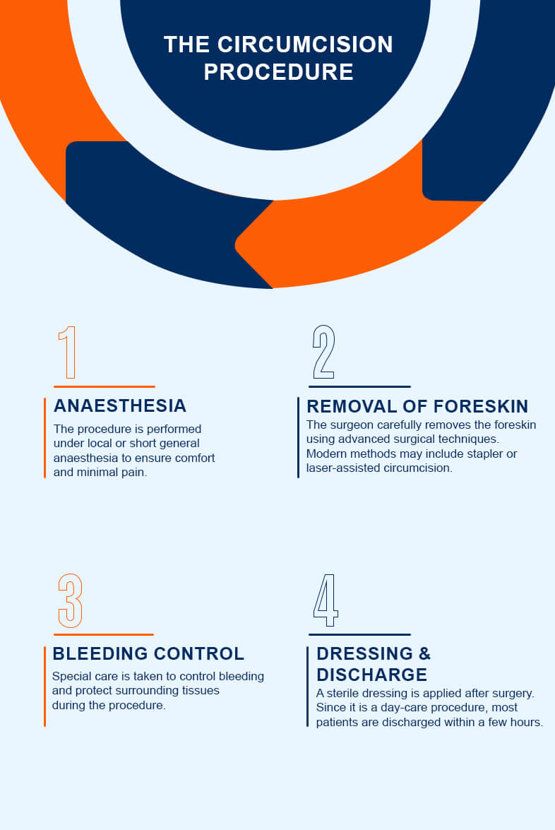 Circumcision is a safe and commonly performed day-care surgical procedure that involves the removal of the foreskin covering the tip of the penis. It is recommended for medical, hygienic, or personal reasons and is performed using advanced techniques for minimal discomfort and faster recovery.