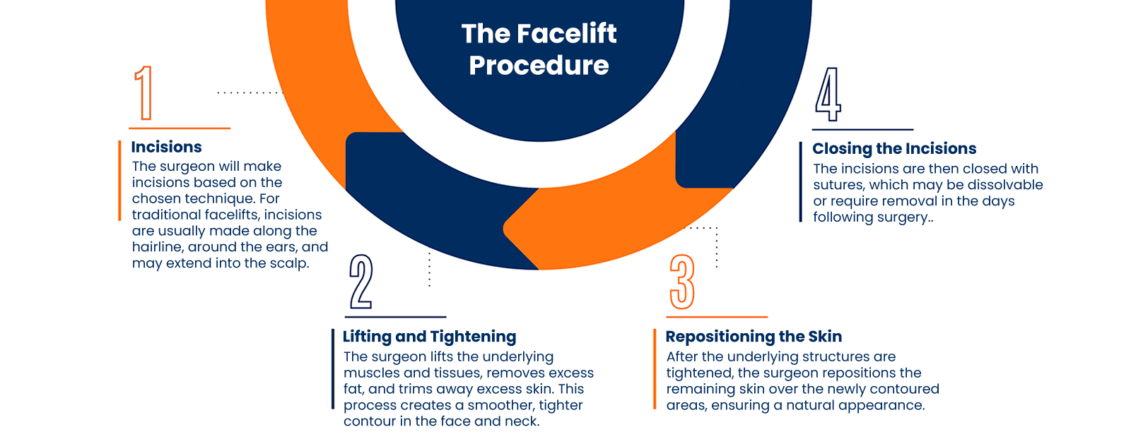 A facelift, or rhytidectomy, is a cosmetic surgical procedure aimed at improving the visible signs of ageing in the face and neck. A facelift can restore a more youthful appearance by tightening and lifting the skin, reducing sagging, and smoothing out wrinkles.