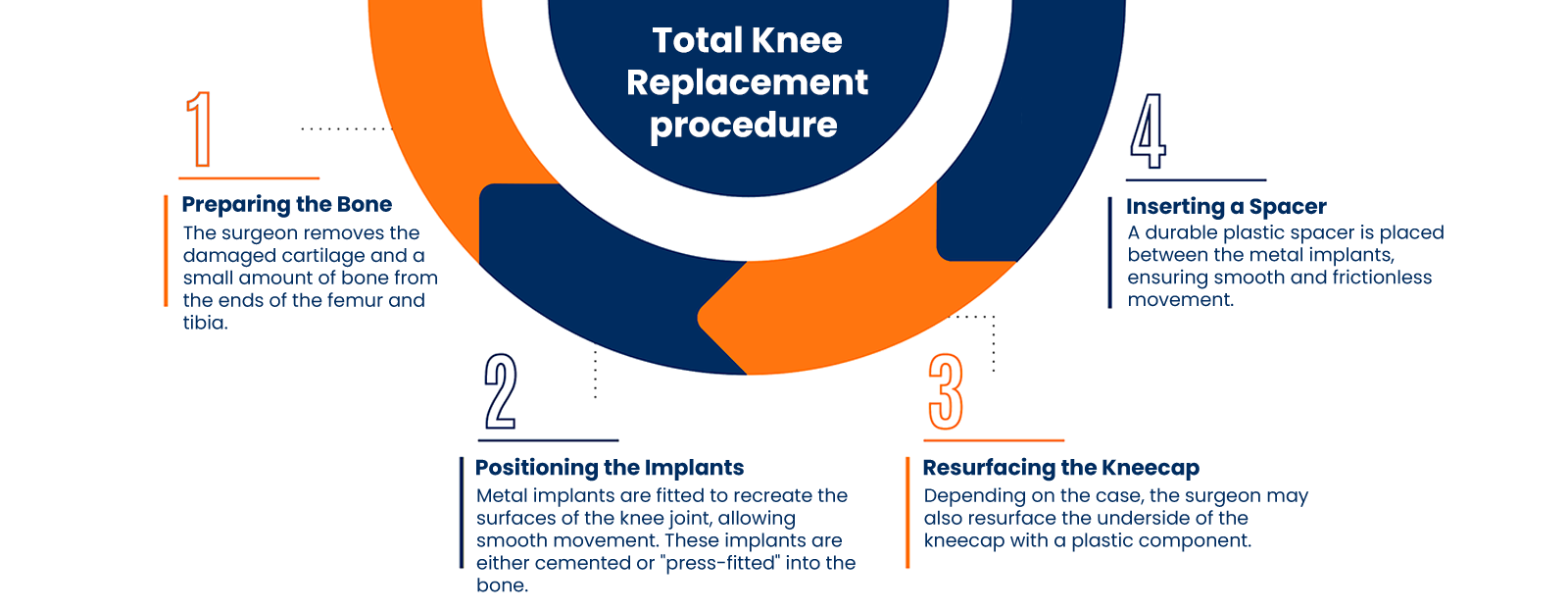 Total Knee Replacement (also known as knee resurfacing) is a procedure where the damaged parts of the knee joint are replaced with artificial implants made of metal and plastic. This surgery can greatly reduce pain, restore function, and improve the quality of life.