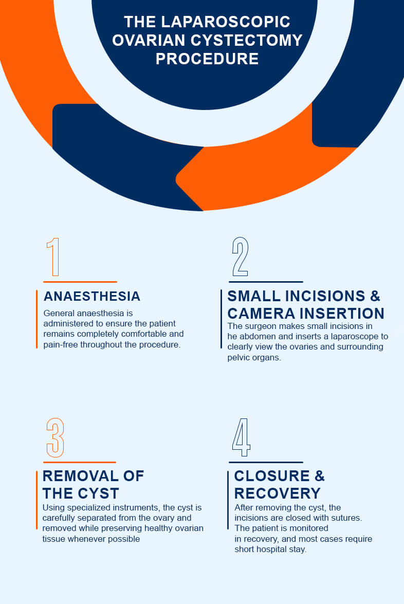 Ovarian Cystectomy is a surgical procedure to remove cysts (fluid-filled sacs) that develop on or inside the ovaries. The goal of the surgery is to eliminate the cyst while preserving the ovary whenever possible.