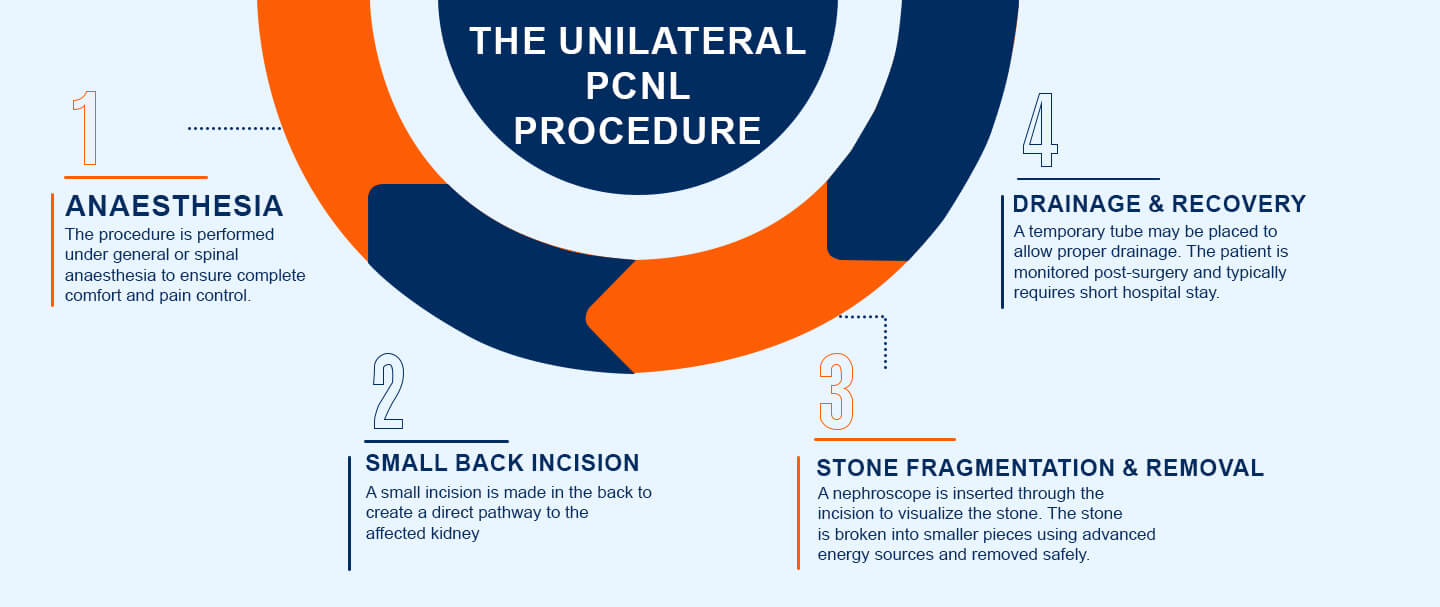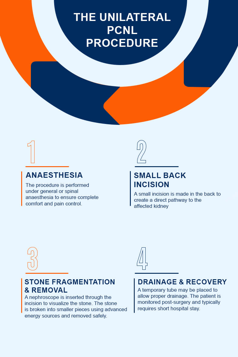 Unilateral PCNL refers to the removal of kidney stones from one kidney only. The procedure is performed using specialized instruments inserted through a small incision, allowing direct access to the affected kidney.